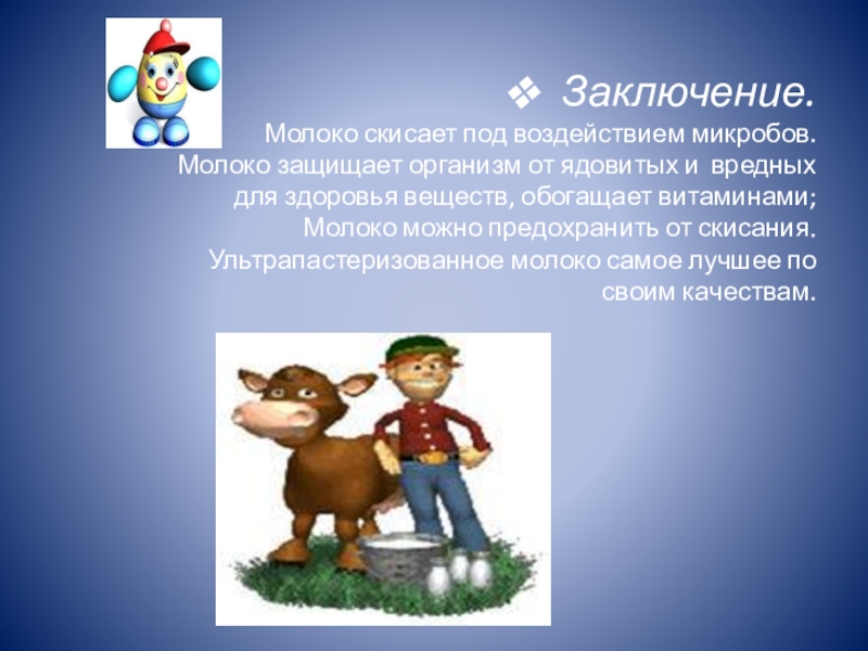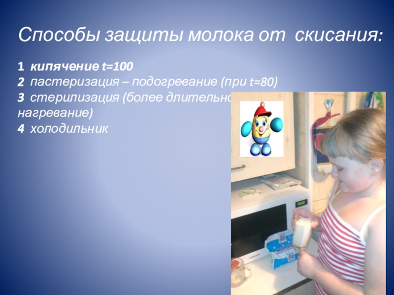 Молоко защищает организм от ядовитых и вредных для здоровья веществ, обогащает витаминами; Молоко можно предохранить от скисания.