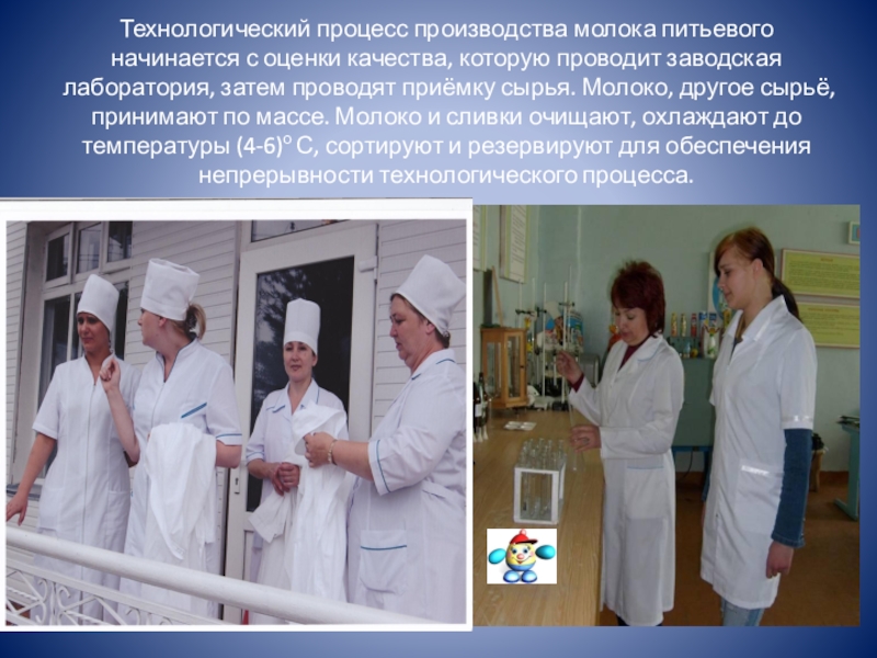 Слайд 22Технологический процесс производства молока питьевого начинается с оценки качества, которую проводит