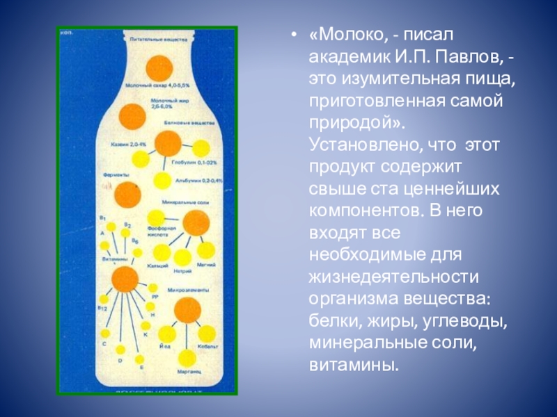 Слайд 8«Молоко, - писал академик И.П. Павлов, - это изумительная пища, приготовленная