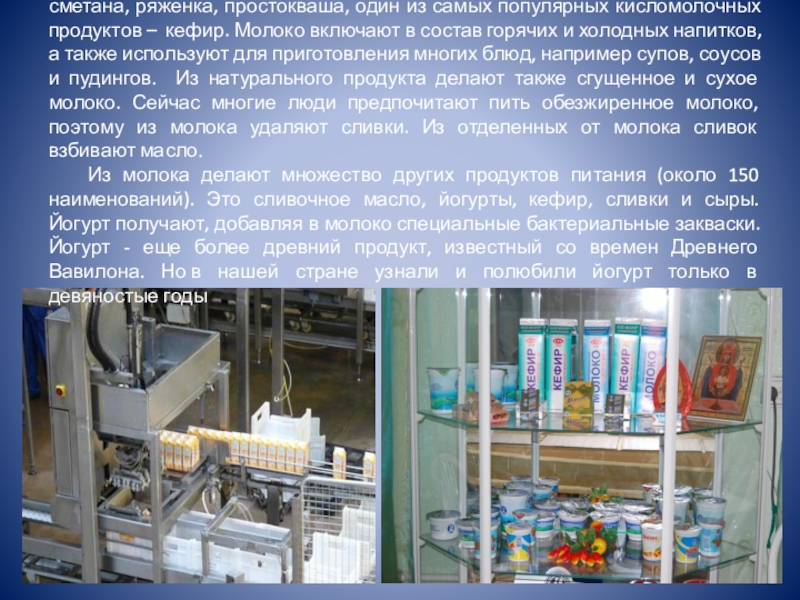 Из молока делают множество других продуктов питания (около 150 наименований). Это сливочное масло, йогурты, кефир, сливки и сыры. Йогурт получают, добавляя в молоко специальные бактериальные закваски. Йогурт - еще более древний продукт, известный со времен Древнего Вавилона. Но в нашей стране узнали и полюбили йогурт только в девяностые годы