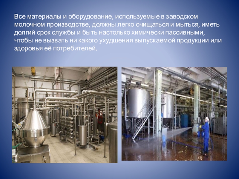 Слайд 25Все материалы и оборудование, используемые в заводском молочном производстве, должны легко