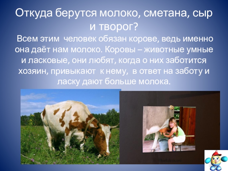 обязан корове, ведь именно она даёт нам молоко. Коровы – животные умные и ласковые, они любят, когда о них заботится хозяин, привыкают к нему, в ответ на заботу и ласку дают больше молока.