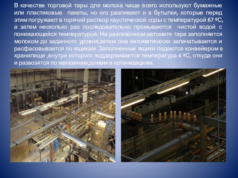 пластиковые пакеты, но его разливают и в бутылки, которые перед этим погружают в горячий раствор каустической соды с температурой 67 ºС, а затем несколько раз последовательно промываются чистой водой с понижающейся температурой. На разливочном автомате тара заполняется молоком до заданного уровня,затем она автоматически запечатывается и расфасовывается по ящикам .Заполненные ящики подаются конвейером в хранилище ,внутри которого поддерживается температура 4 ºС, откуда они и развозятся по магазинам,домам и организациям.