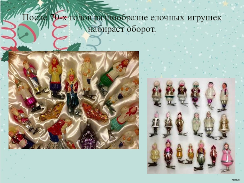 Слайд 12После 70-х годов разнообразие елочных игрушек набирает оборот.