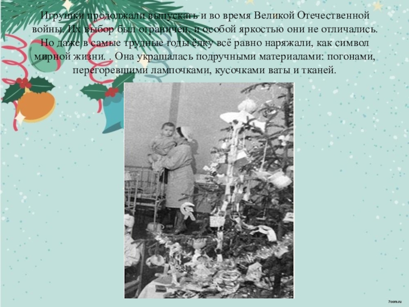 был ограничен, и особой яркостью они не отличались. Но даже в самые трудные годы ёлку всё равно наряжали, как символ мирной жизни. . Она украшалась подручными материалами: погонами, перегоревшими лампочками, кусочками ваты и тканей.