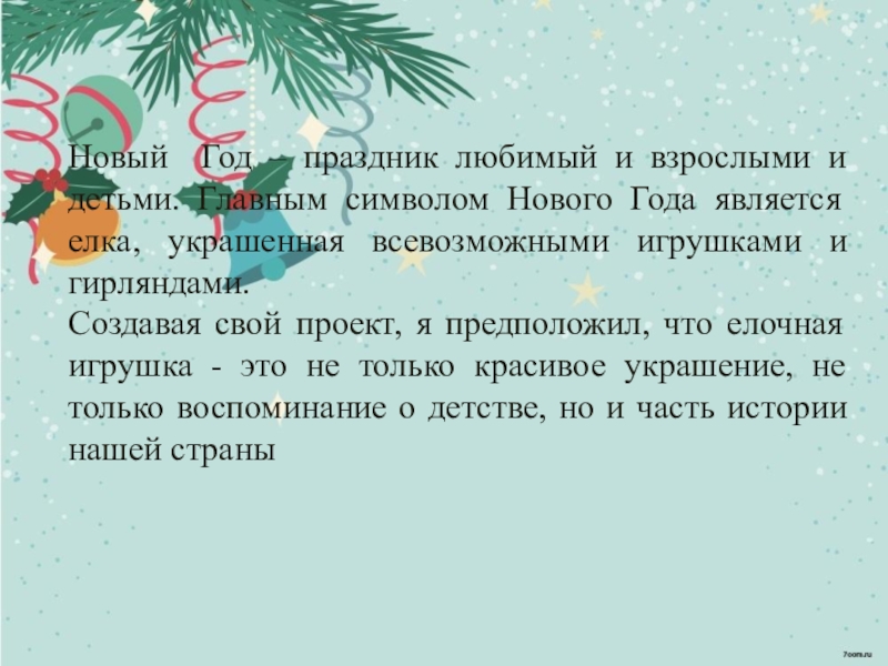 Создавая свой проект, я предположил, что елочная игрушка - это не только красивое украшение, не только воспоминание о детстве, но и часть истории нашей страны