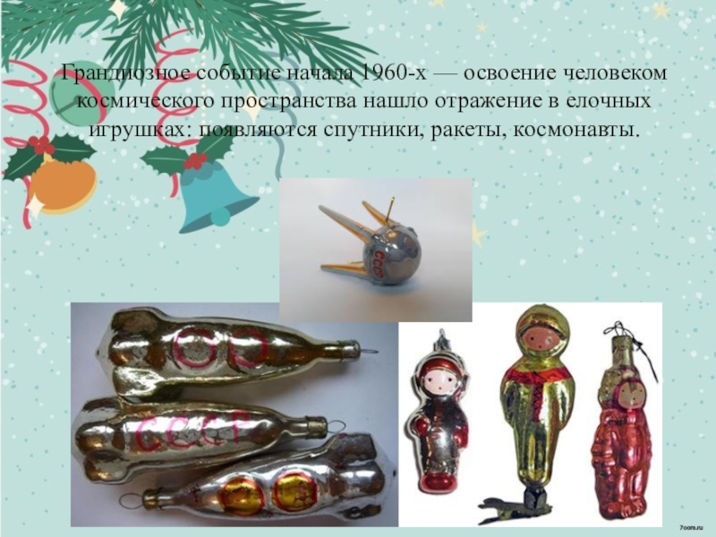 в елочных игрушках: появляются спутники, ракеты, космонавты.