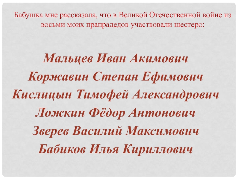 Целью исследования является изучение жизненного пути прапрадедушек, участников Великой Отечественной войны, а также прабабушек.