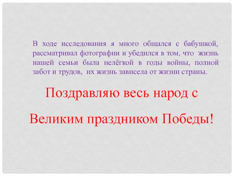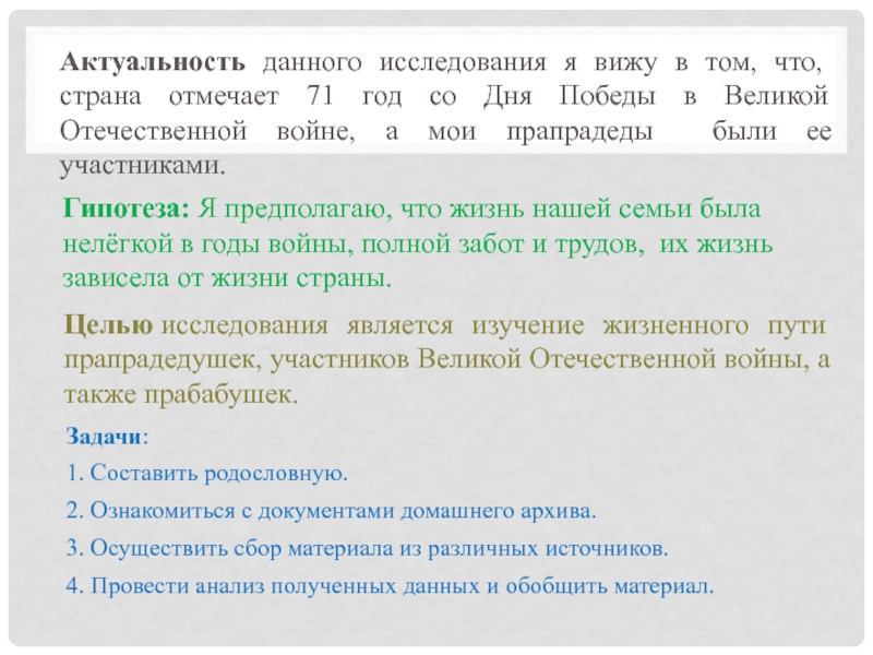 Гипотеза: Я предполагаю, что жизнь нашей семьи была нелёгкой в годы войны, полной забот и трудов, их жизнь зависела от жизни страны.