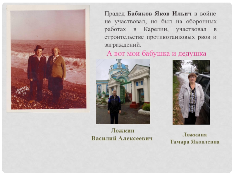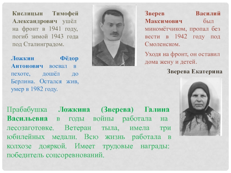 Прабабушка Ложкина (Зверева) Галина Васильевна в годы войны работала на лесозаготовке. Ветеран тыла, имела три юбилейных медали. Всю жизнь работала в колхозе дояркой. Имеет трудовые награды: победитель соцсоревнований.