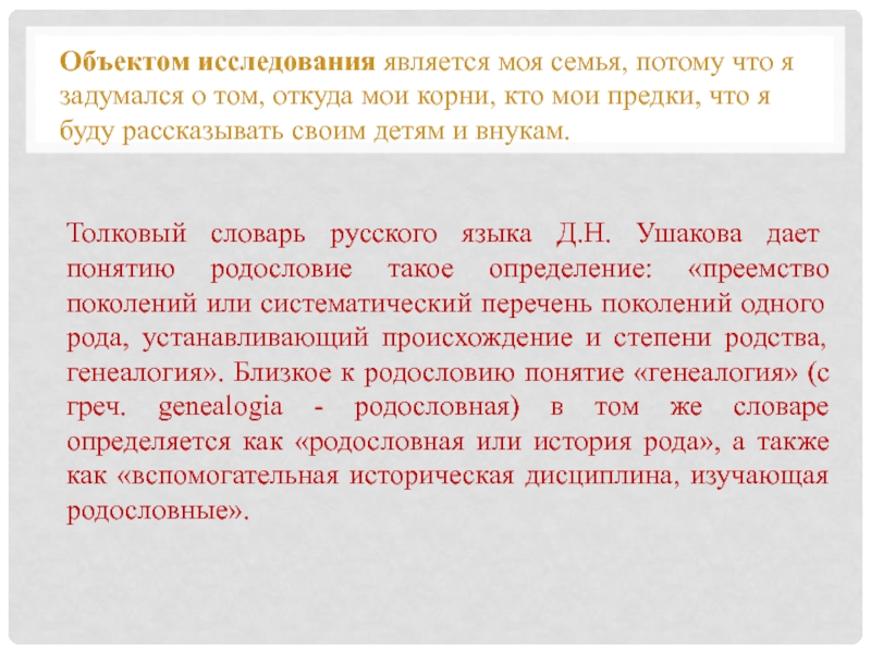 Толковый словарь русского языка Д.Н. Ушакова дает понятию родословие такое определение: «преемство поколений или систематический перечень поколений одного рода, устанавливающий происхождение и степени родства, генеалогия». Близкое к родословию понятие «генеалогия» (с греч. genealogia - родословная) в том же словаре определяется как «родословная или история рода», а также как «вспомогательная историческая дисциплина, изучающая родословные».