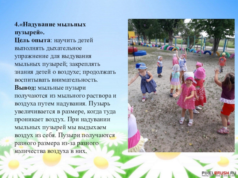 Цель опыта: научить детей выполнять дыхательное упражнение для выдувания