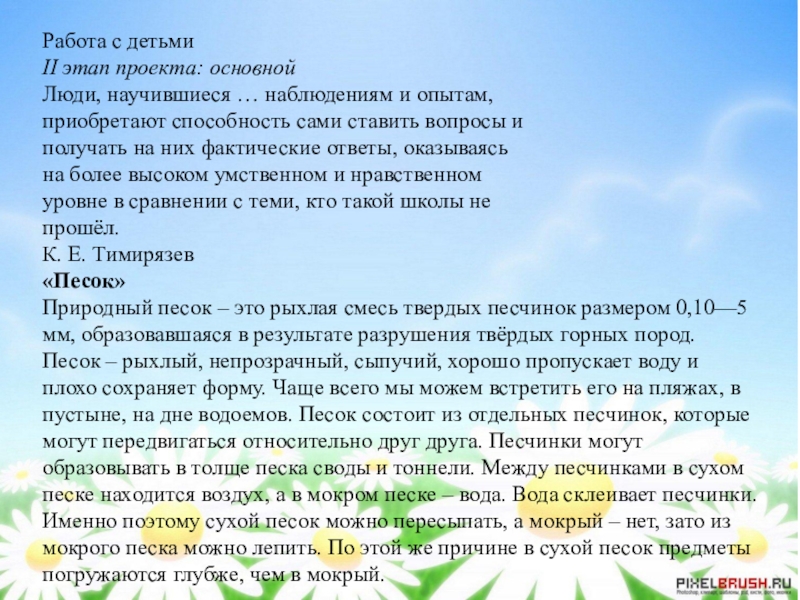 Вывод: песок – сыпучее вещество и состоит из мельчайших камушков, движение песка похоже на течение.
