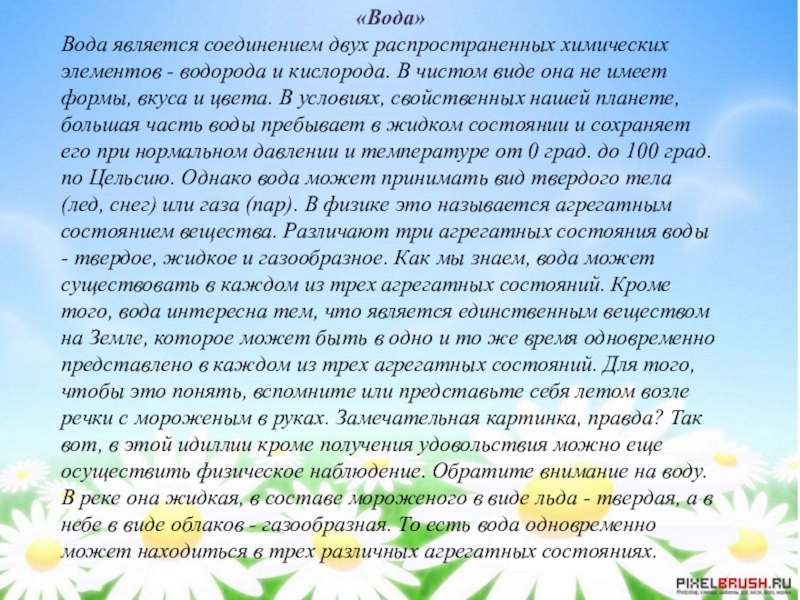В чистом виде она не имеет формы, вкуса и цвета. В условиях, свойственных нашей планете, большая часть воды пребывает в жидком состоянии и сохраняет его при нормальном давлении и температуре от 0 град. до 100 град. по Цельсию. Однако вода может принимать вид твердого тела (лед, снег) или газа (пар). В физике это называется агрегатным состоянием вещества. Различают три агрегатных состояния воды - твердое, жидкое и газообразное. Как мы знаем, вода может существовать в каждом из трех агрегатных состояний. Кроме того, вода интересна тем, что является единственным веществом на Земле, которое может быть в одно и то же время одновременно представлено в каждом из трех агрегатных состояний. Для того, чтобы это понять, вспомните или представьте себя летом возле речки с мороженым в руках. Замечательная картинка, правда? Так вот, в этой идиллии кроме получения удовольствия можно еще осуществить физическое наблюдение. Обратите внимание на воду. В реке она жидкая, в составе мороженого в виде льда - твердая, а в небе в виде облаков - газообразная. То есть вода одновременно может находиться в трех различных агрегатных состояниях.