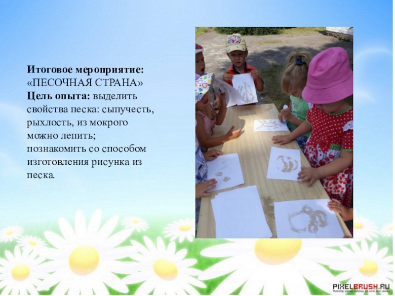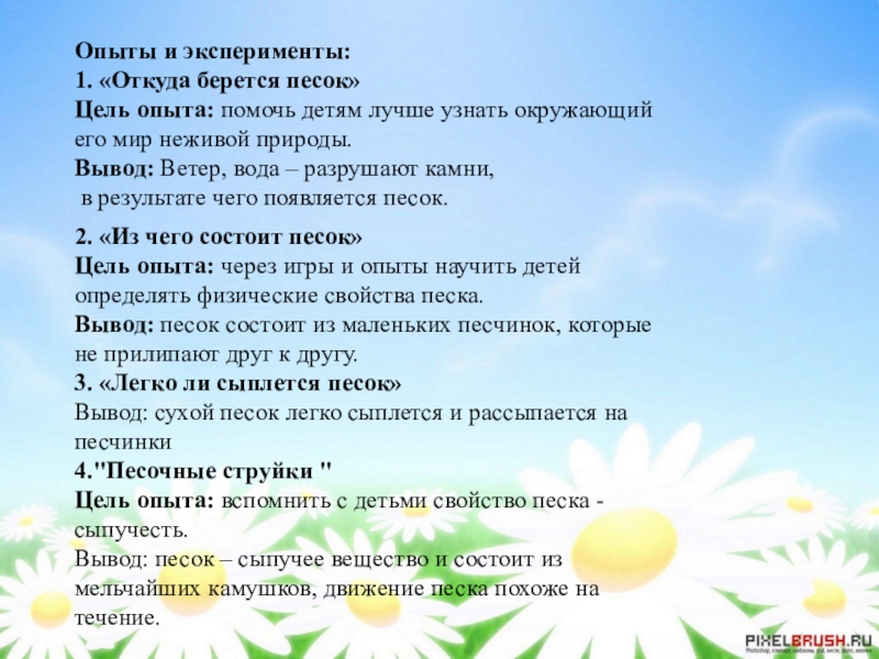Цель опыта: через игры и опыты научить детей определять физические свойства песка.