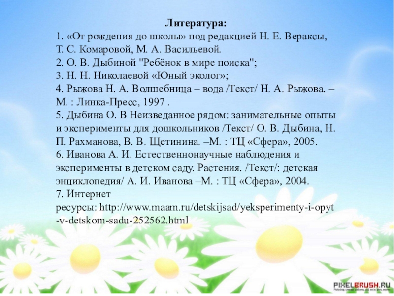 7. Интернет ресурсы: http://www.maam.ru/detskijsad/yeksperimenty-i-opyt-v-detskom-sadu-252562.html