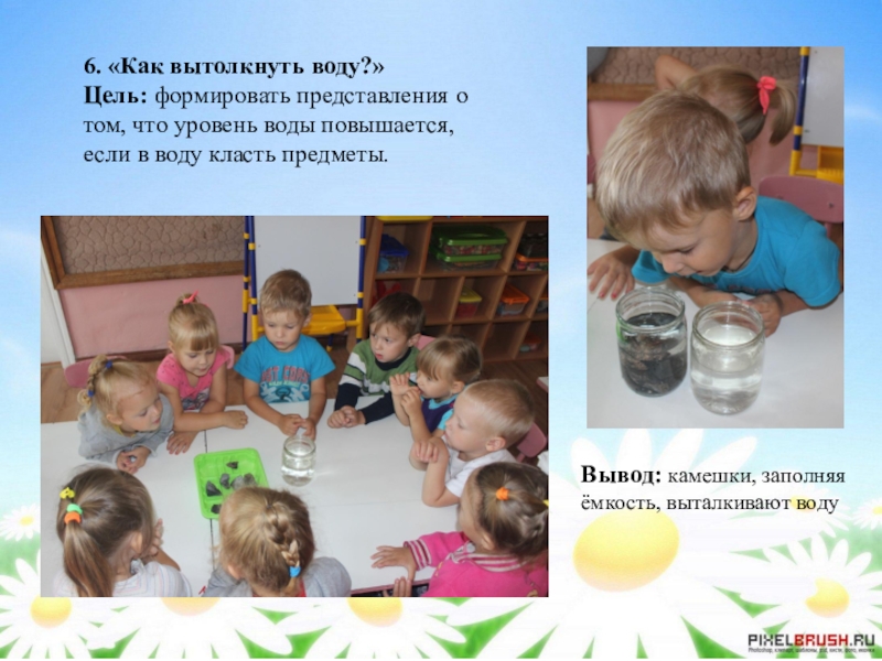 знакомство детей с окружающим миром (свойства воды, качества материалов, действия с водой и предметами).