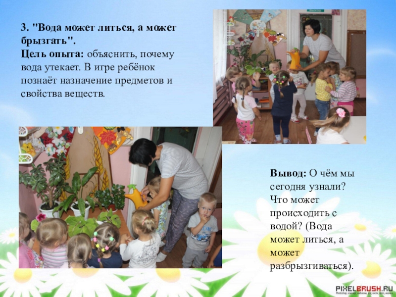 Вывод: О чём мы сегодня узнали? Что может происходить с водой? (Вода может литься, а может разбрызгиваться).