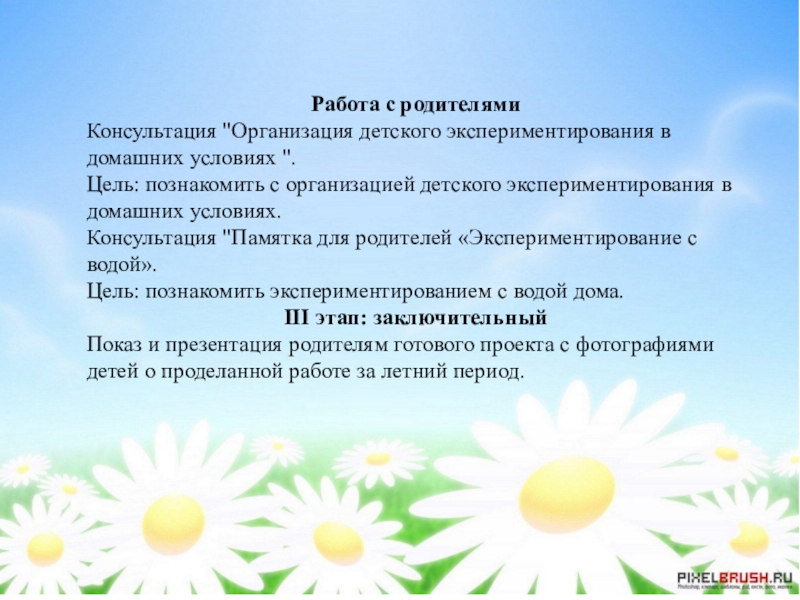 Показ и презентация родителям готового проекта с фотографиями детей о проделанной работе за летний период.