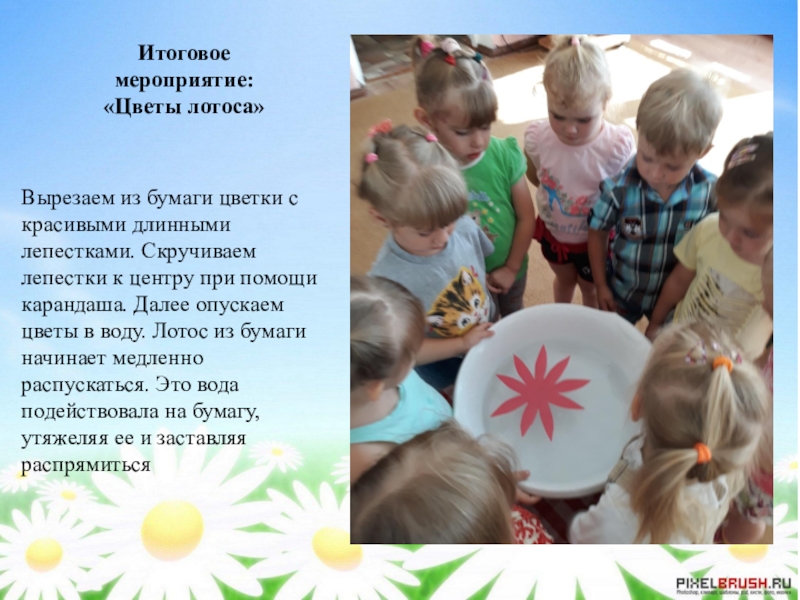 лепестки к центру при помощи карандаша. Далее опускаем цветы в воду. Лотос из бумаги начинает медленно распускаться. Это вода подействовала на бумагу, утяжеляя ее и заставляя распрямиться