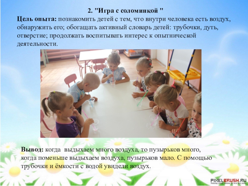 внутри человека есть воздух, обнаружить его; обогащать активный словарь детей: трубочки, дуть, отверстие; продолжать воспитывать интерес к опытнической деятельности.