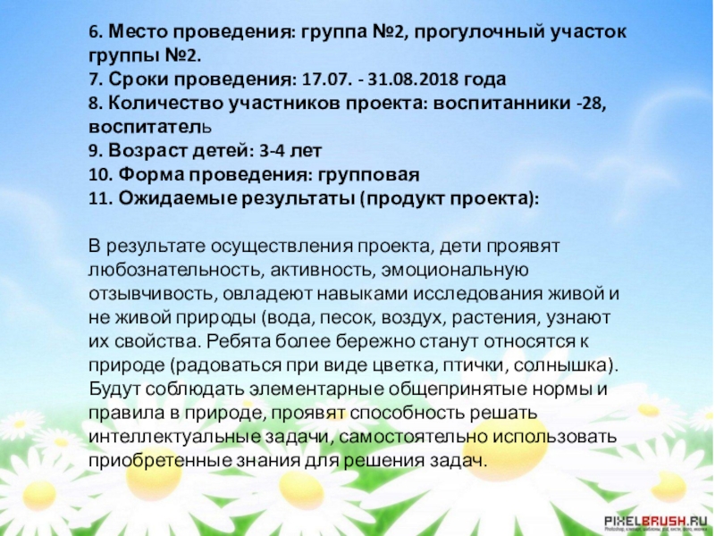В результате осуществления проекта, дети проявят любознательность, активность, эмоциональную отзывчивость, овладеют навыками исследования живой и не живой природы (вода, песок, воздух, растения, узнают их свойства. Ребята более бережно станут относятся к природе (радоваться при виде цветка, птички, солнышка). Будут соблюдать элементарные общепринятые нормы и правила в природе, проявят способность решать интеллектуальные задачи, самостоятельно использовать приобретенные знания для решения задач.