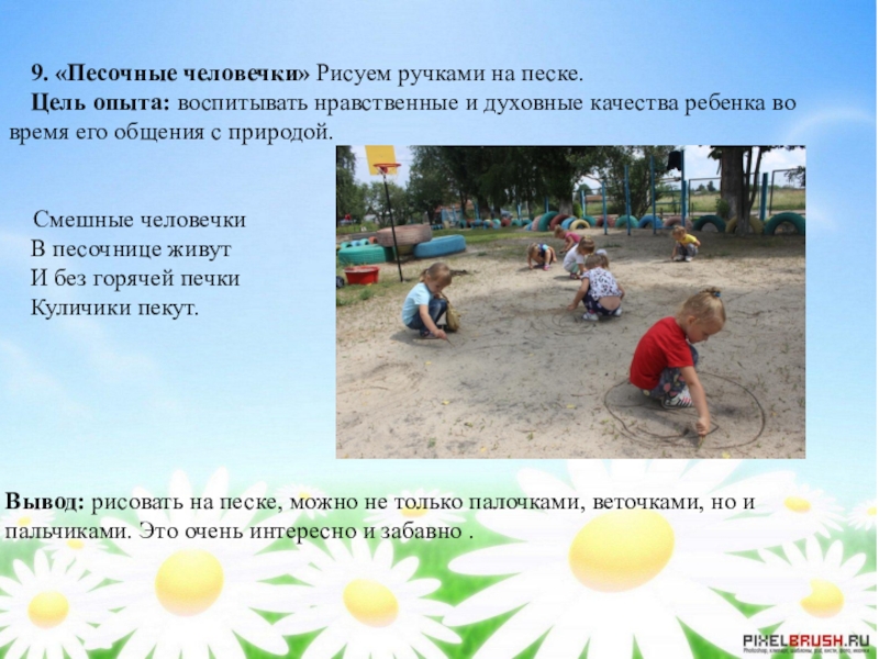 можно лепить; познакомить со способом изготовления рисунка из песка.