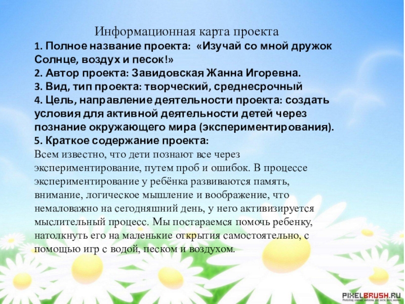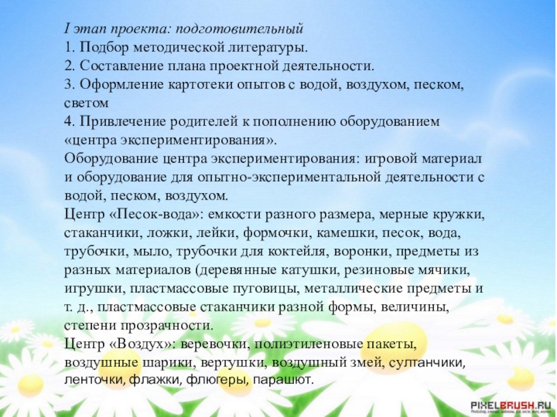 Всем известно, что дети познают все через экспериментирование, путем проб и ошибок. В процессе экспериментирование у ребёнка развиваются память, внимание, логическое мышление и воображение, что немаловажно на сегодняшний день, у него активизируется мыслительный процесс. Мы постараемся помочь ребенку, натолкнуть его на маленькие открытия самостоятельно, с помощью игр с водой, песком и воздухом.