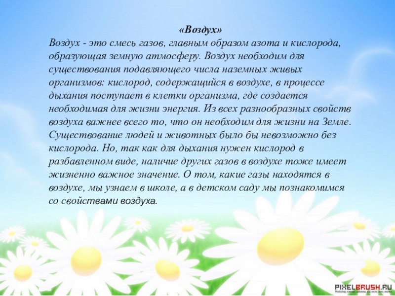 земную атмосферу. Воздух необходим для существования подавляющего числа наземных живых организмов: кислород, содержащийся в воздухе, в процессе дыхания поступает в клетки организма, где создается необходимая для жизни энергия. Из всех разнообразных свойств воздуха важнее всего то, что он необходим для жизни на Земле. Существование людей и животных было бы невозможно без кислорода. Но, так как для дыхания нужен кислород в разбавленном виде, наличие других газов в воздухе тоже имеет жизненно важное значение. О том, какие газы находятся в воздухе, мы узнаем в школе, а в детском саду мы познакомимся со свойствами воздуха.
