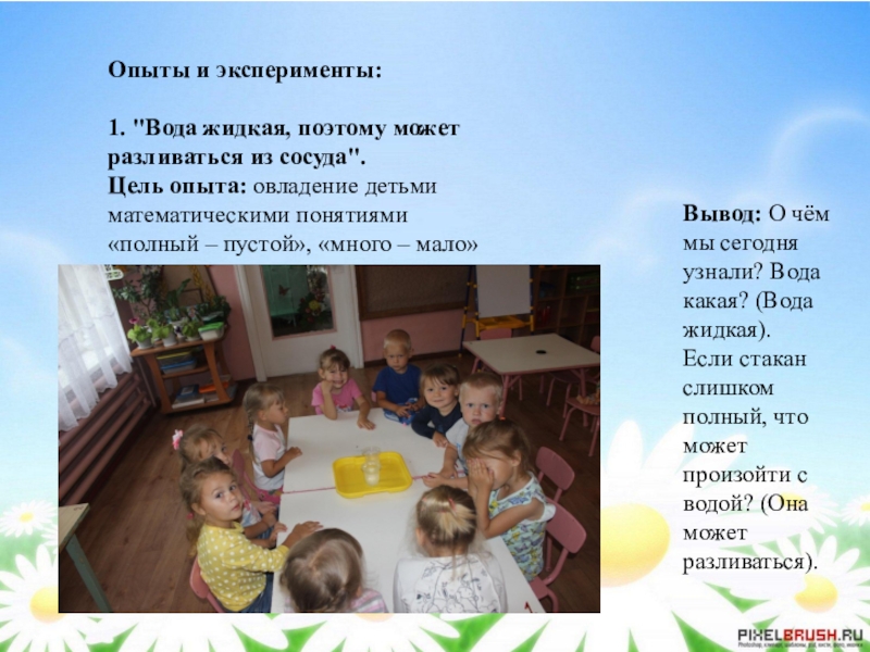 Вывод: О чём мы сегодня узнали? Вода какая? (Вода жидкая).