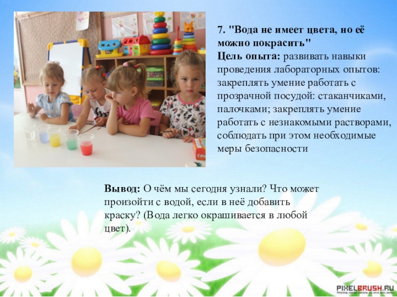 Вывод: О чём мы сегодня узнали? Что может произойти с водой, если в неё добавить краску? (Вода легко окрашивается в любой цвет).