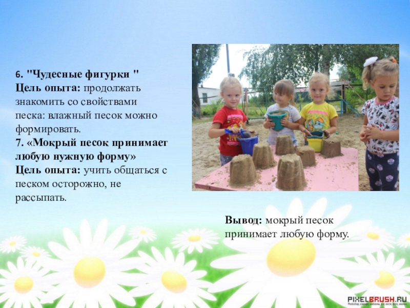 Цель опыта: продолжать знакомить со свойствами песка: влажный