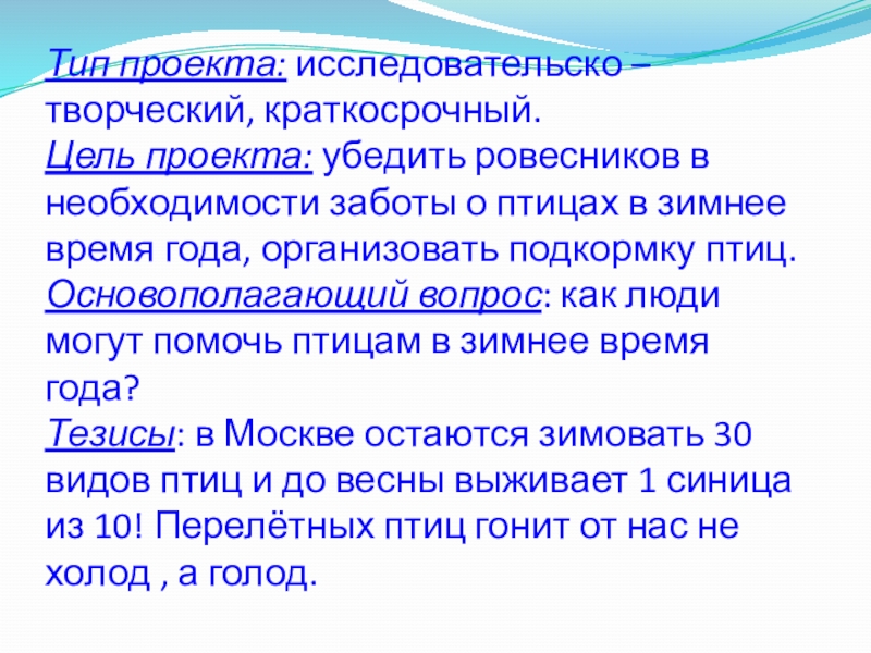 Тезисы: в Москве остаются зимовать 30 видов птиц и до весны выживает 1 синица из 10! Перелётных птиц гонит от нас не холод , а голод.