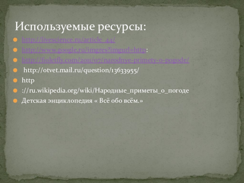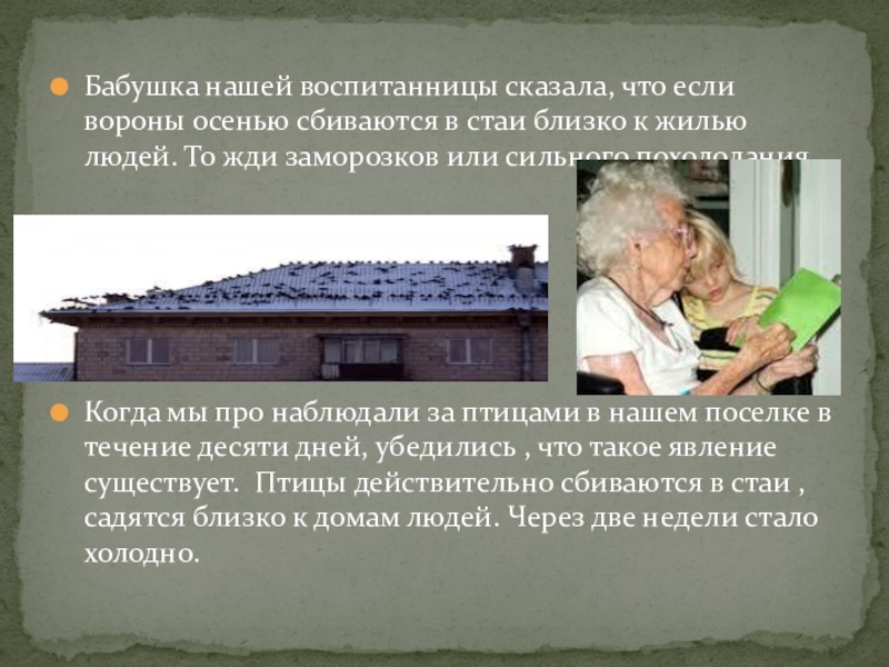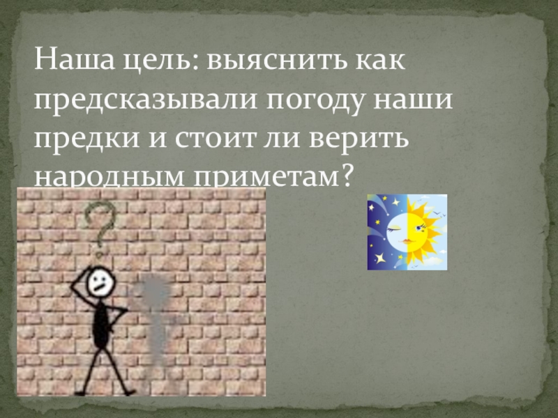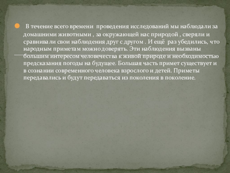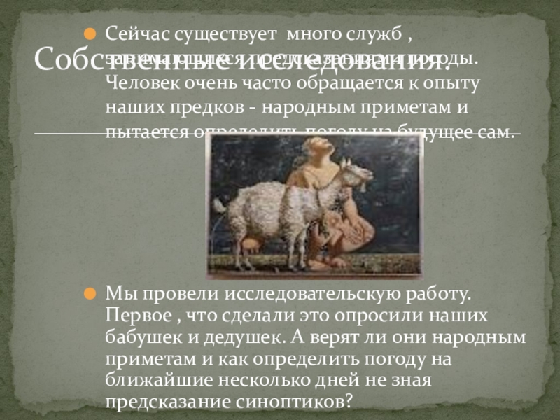 Мы провели исследовательскую работу. Первое , что сделали это опросили наших бабушек и дедушек. А верят ли они народным приметам и как определить погоду на ближайшие несколько дней не зная предсказание синоптиков?