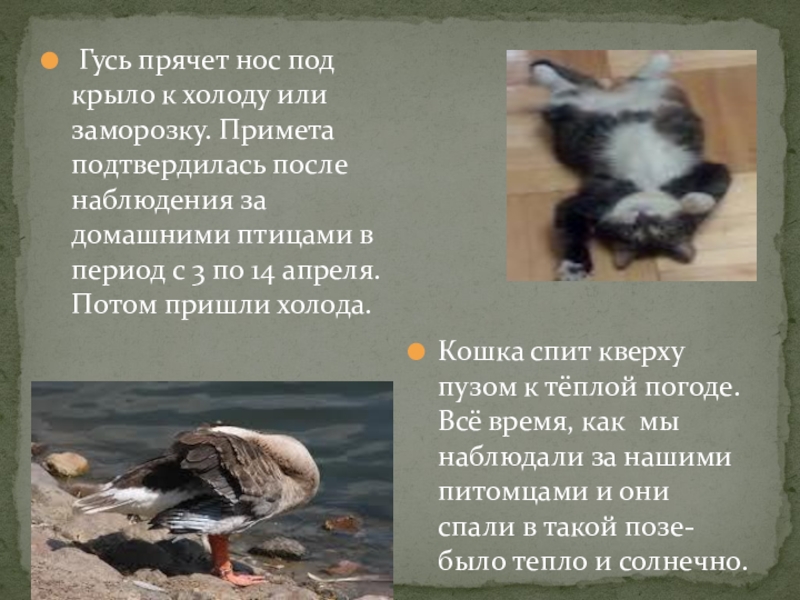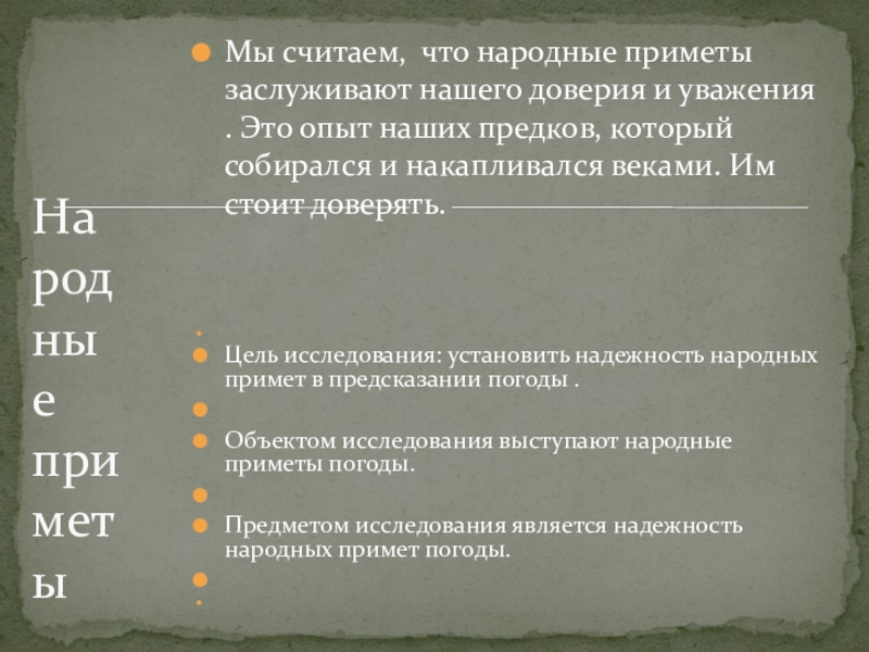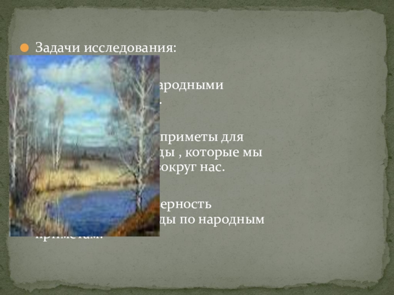 Цель исследования: установить надежность народных примет в предсказании погоды .