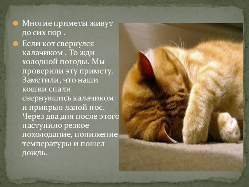 Кошка спит кверху пузом к тёплой погоде. Всё время, как мы наблюдали за нашими питомцами и они спали в такой позе- было тепло и солнечно.