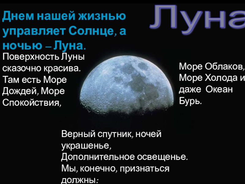 Поверхность Луны сказочно красива. Там есть Море Дождей, Море Спокойствия,
