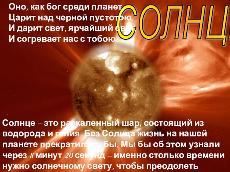 Солнце – это раскаленный шар, состоящий из водорода и гелия. Без Солнца жизнь на нашей планете прекратилась бы. Мы бы об этом узнали через 8 минут 20 секунд – именно столько времени нужно солнечному свету, чтобы преодолеть расстояние до Земли – 150 млн. км.