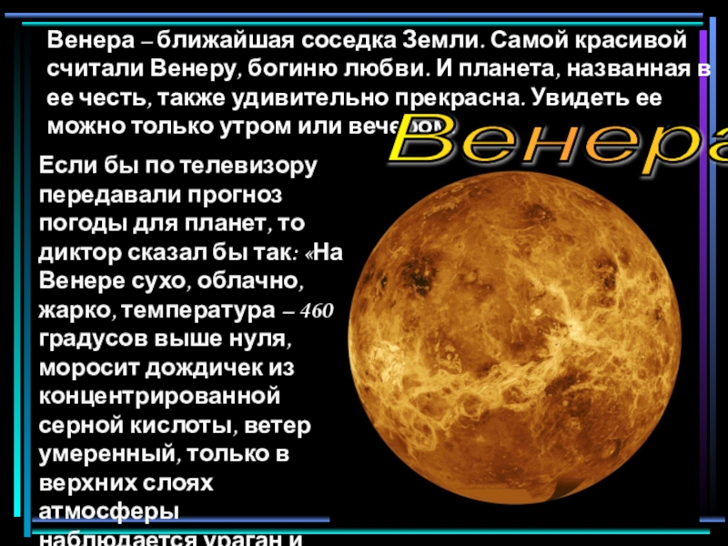 Если бы по телевизору передавали прогноз погоды для планет, то диктор сказал бы так: «На Венере сухо, облачно, жарко, температура – 460 градусов выше нуля, моросит дождичек из концентрированной серной кислоты, ветер умеренный, только в верхних слоях атмосферы наблюдается ураган и многочисленные вспышки молний».