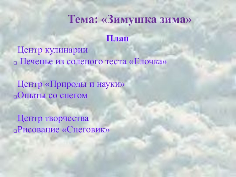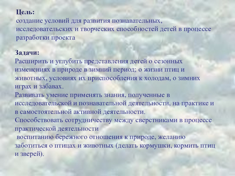 Расширить и углубить представления детей о сезонных изменениях в природе в зимний период; о жизни птиц и животных, условиях их приспособления к холодам, о зимних играх и забавах.