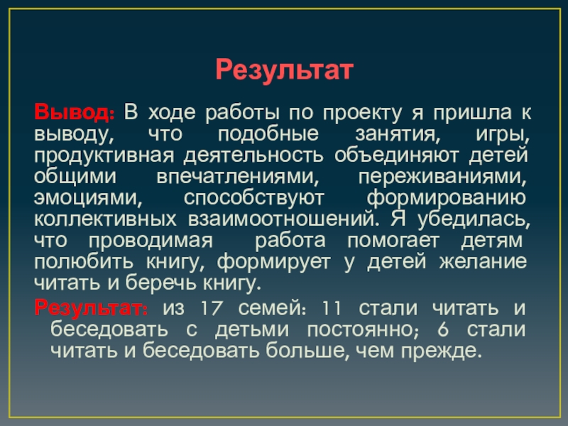 Результат: из 17 семей: 11 стали читать и беседовать с детьми постоянно; 6 стали читать и беседовать больше, чем прежде.