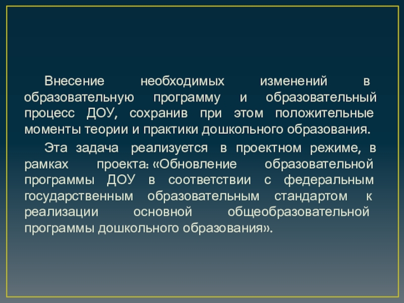 Слайд 3 Внесение необходимых изменений в образовательную программу и образовательный процесс ДОУ, сохранив