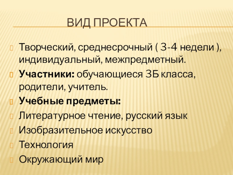 Творческий, среднесрочный ( 3-4 недели ), индивидуальный, межпредметный.