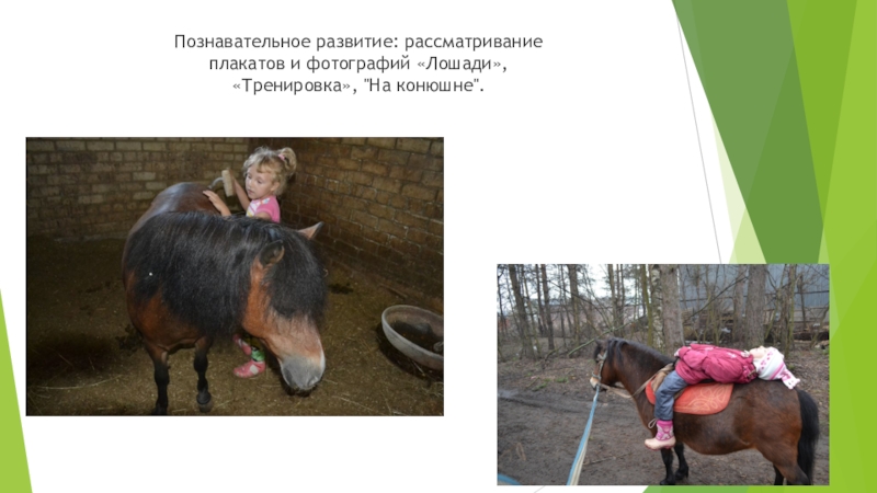 Слайд 10Познавательное развитие: рассматривание плакатов и фотографий «Лошади», «Тренировка», "На конюшне".