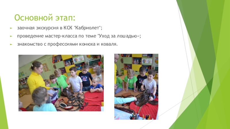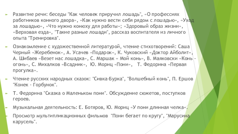 двора», «Как нужно вести себя рядом с лошадью», «Уход за лошадью», «Что нужно конюху для работы»; «Здоровый образ жизни», «Верховая езда», "Такие разные лошади", рассказ воспитателя из личного опыта "Тренировка".