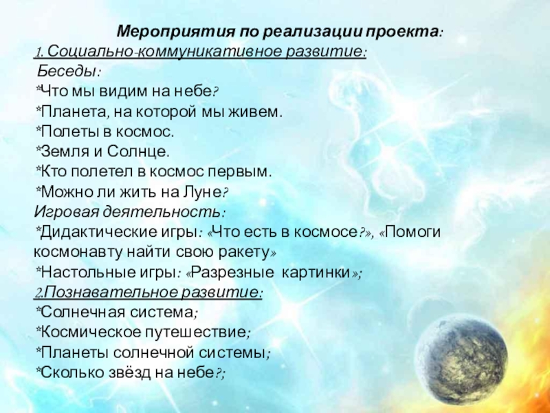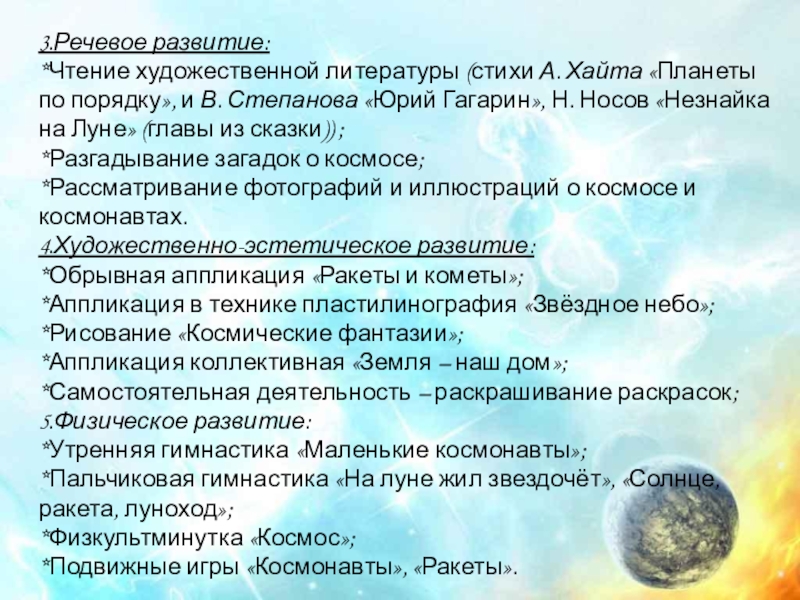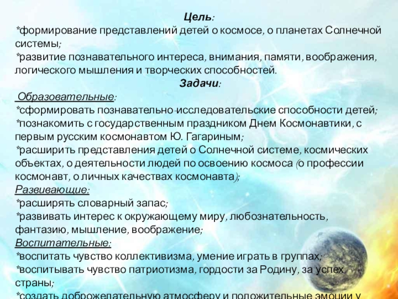 *формирование представлений детей о космосе, о планетах Солнечной системы;