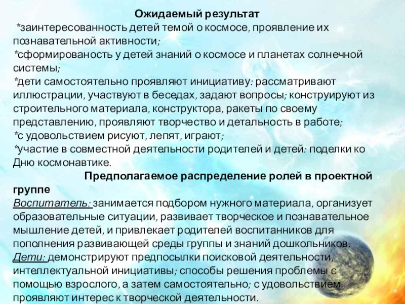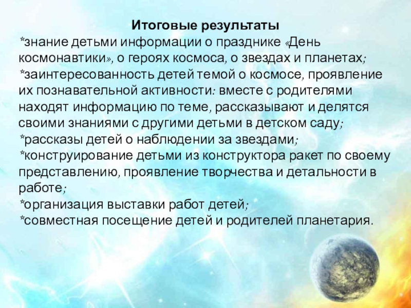 *заинтересованность детей темой о космосе, проявление их познавательной активности: вместе с родителями находят информацию по теме, рассказывают и делятся своими знаниями с другими детьми в детском саду;