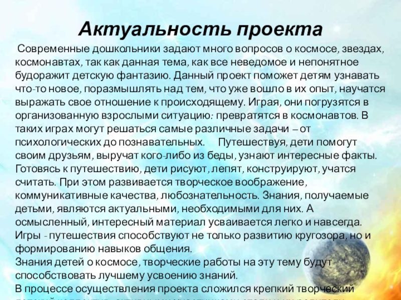 как данная тема, как все неведомое и непонятное будоражит детскую фантазию. Данный проект поможет детям узнавать что-то новое, поразмышлять над тем, что уже вошло в их опыт, научатся выражать свое отношение к происходящему. Играя, они погрузятся в организованную взрослыми ситуацию: превратятся в космонавтов. В таких играх могут решаться самые различные задачи – от психологических до познавательных. Путешествуя, дети помогут своим друзьям, выручат кого-либо из беды, узнают интересные факты. Готовясь к путешествию, дети рисуют, лепят, конструируют, учатся считать. При этом развивается творческое воображение, коммуникативные качества, любознательность. Знания, получаемые детьми, являются актуальными, необходимыми для них. А осмысленный, интересный материал усваивается легко и навсегда. Игры - путешествия способствуют не только развитию кругозора, но и формированию навыков общения.