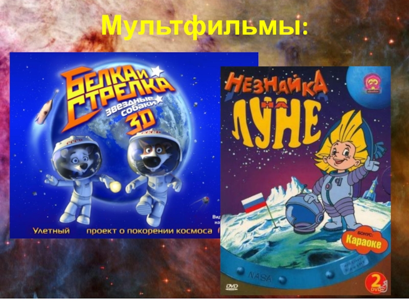 Просмотр дома с родителями мультфильмов на тему космоса. «Белка и Стрелка», «Незнайка на луне» и др.