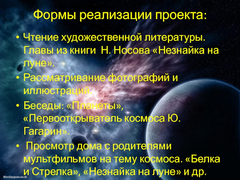 Формы реализации проекта: Чтение художественной литературы. Главы из книги Н. Носова «Незнайка на луне».Рассматривание фотографий и иллюстраций.Беседы: